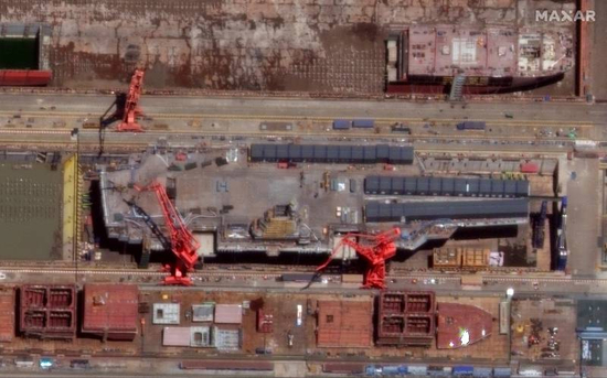 Maxar5月31日拍摄的卫星图像显示,正建造中国第三艘航母的干船坞已经清空了船坞前较小船只并拆除了船坞作业装置。而此前的图像显示,就在10天前,这些船只和作业装置还在。CSIS说,这证实这艘航母随时能够下水进入长江,不过航母可能还需要数年时间才能完全生成战斗力。