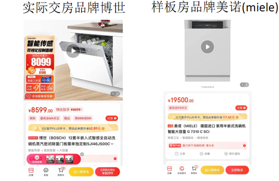 以厨具为例,样板间用作展示的冰箱、油烟机、洗碗机、炉灶、蒸箱等均为美诺品牌,而金众麒麟公馆实际交付品牌则为博世。