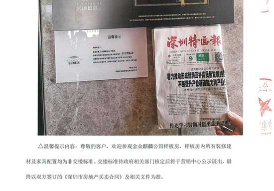 对此开发商方面给出的解释是,所使用的品牌并未违背业主初衷,是合同中明确约定的相应品牌,也是公示、备案的品牌。于样板房门口,也有相应的样板房内所有装修建材及家具配置均为非交楼标准等提示内容。