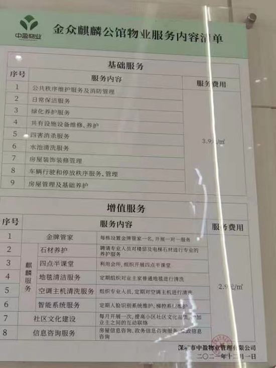 目前深圳市官方规定的现行高层住宅每月最高收费为3.9元/㎡,项目物业中盈物业于南山区住建局备案的前期物业合同收费也为3.9元/㎡·月,但业主还额外签署了一增值服务合同,实际每月物业费标准为6.8元/㎡。