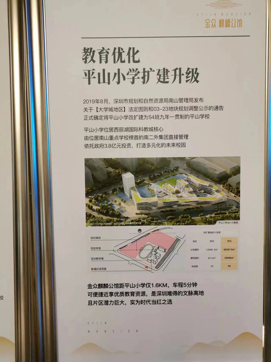 对此开发商方面给出的回复是,项目在宣传过程中,仅是将周边的学校资源均列了出来,并未承诺对口学校,不仅是平山小学,其他学校也有做相应展示。