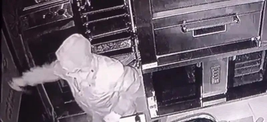 举报男子还表示,在被该团伙威胁骚扰后,其蛋糕店先后两次被不明身份的蒙面人进行故意破坏和暴力打砸。该举报男子还提供了蛋糕店被打砸的监控视频。其中一段视频中,深夜里,一蒙面人在店外破窗进入蛋糕店内,随后手持锤子对店内各项设施进行打砸破坏,各展柜的玻璃均被砸碎,空调也被推倒在地,最后该蒙面人砸碎玻璃门从店内走出。