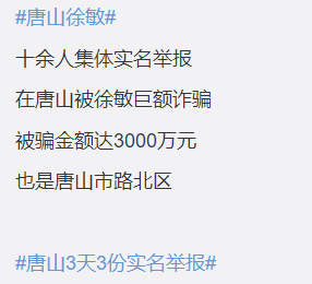 6月10日河北唐山蛋糕店老板实名举报涉黑团伙敲诈勒索、暴力打砸后,6月11日、12日分别有女子实名举报遭逼迫下跪打“白条”,多人实名举报唐山女子徐某诈骗。三天三份举报。