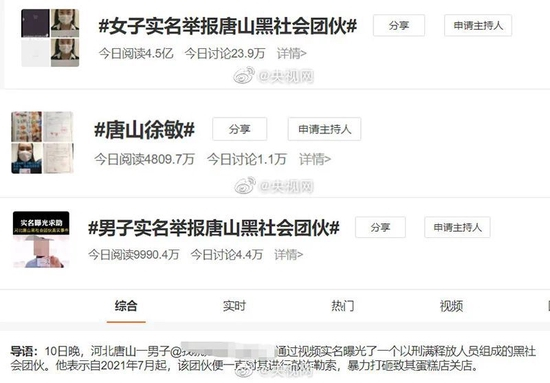 在此之前,河北唐山一男子实名举报涉黑团伙,引发关注。据北京青年报此前报道,6月10日晚,河北唐山一名蛋糕店老板通过视频,实名曝光一个以刑满释放人员组成的涉嫌黑社会团伙。他在视频中表示自2021年7月起,该团伙一直对其进行敲诈勒索、暴力打砸,并致其蛋糕店闭店停业。6月11日,北京青年报记者从河北唐山市委政法委员会了解到,相关部门已经关注蛋糕店老板实名举报唐山涉黑团伙事件,正在核查中,会对事件后续的调查及解决进度进行回应。