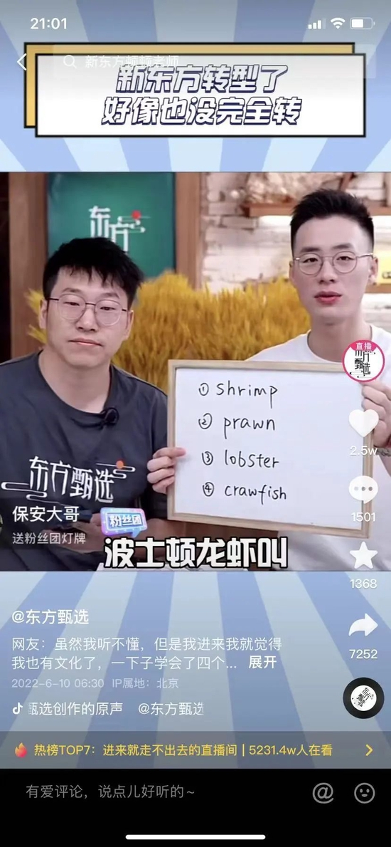 从一开始,东方甄选的风格就是讲课式直播,无论介绍苹果还是羊肉,都会顺带讲一点相关知识,但和其他主播相比,这个记忆点并不特别突出。直到找到英语教学这个“卖点”,再加上董宇辉的绝佳口才,东方甄选才一举出圈。
