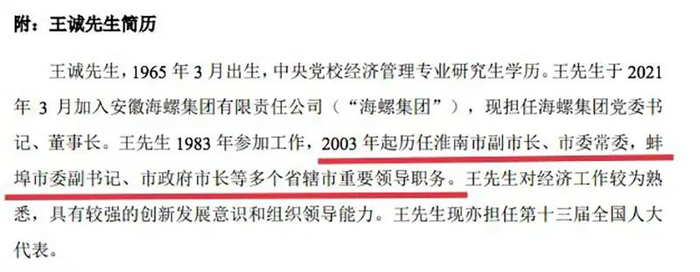 公开信息显示,在担任海螺集团董事长前,王诚早期曾在安徽省淮南市工作,历任共青团淮南市委书记;田家庵区区长;淮南市政府副市长,市委常委、副市长,市委常委、常务副市长等职。2013年,王诚调任蚌埠市委副书记,此后历任蚌埠市代理市长、党组书记;蚌埠市委副书记,蚌埠市人民政府市长、党组书记等职。
