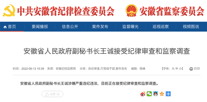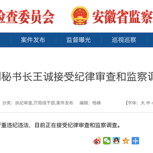 6月13日,安徽省纪委、监委消息显示,安徽省人民政府副秘书长王诚涉嫌严重违纪违法,目前正在接受纪律审查和监察调查。