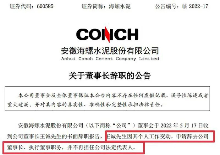 回溯公告,5月17日海螺水泥刚披露,董事长王诚因个人工作变动原因,辞去公司董事长、执行董事职务,并不再担任法定代表人。
