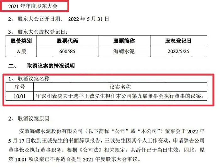 王诚卸任海螺集团董事长时,第八届董事会任期即将届满。海螺水泥公告显示,由于王诚已经辞任董事长职务,海螺水泥2021年年度股东大会上《审议和表决关于选举王诚先生担任本公司第九届董事会执行董事的议案》也因故取消。