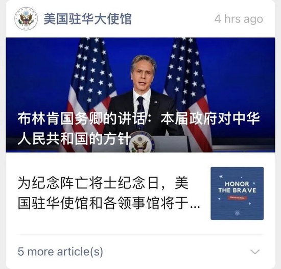 美国议员举例说,不久前美国国务卿布林肯发表对华政策演讲后,中国封杀了美国驻华使馆在微信上刊登的演讲全文的中文翻译,并且限制这篇演说在社交平台上传播。但大家看,中方限制的是这篇演讲的内容,而非美国驻华使馆的账号。而美国驻华使馆账号上面的有些内容按照中国管理的标准是有害的,中国人的账号通常是不能发它们的,发了会被删掉,但出于外交原因那些内容却在美使馆的账号上保留了下来。我想说的就是,中国决没有歧视美国官方和官员的账号。