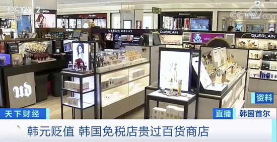 在首尔市的一个时尚潮流聚集地,一家大型市内免税店主打年轻人喜爱的香水、化妆品等轻奢类商品,并且以美元为基准来标注价格。最近,韩元对美元的汇率下跌至近13年来新低,作为免税店主要顾客群体的韩国消费者在以韩元来购买免税品时越来越不划算。尤其是与百货商店品牌重合度较高的部分化妆品,甚至出现免税价比百货商店售价还要贵的奇怪现象。