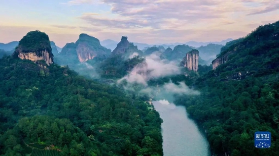 武夷山九曲溪两岸的丹霞景观(6月7日摄,无人机照片)。新华社记者 姜克红 摄