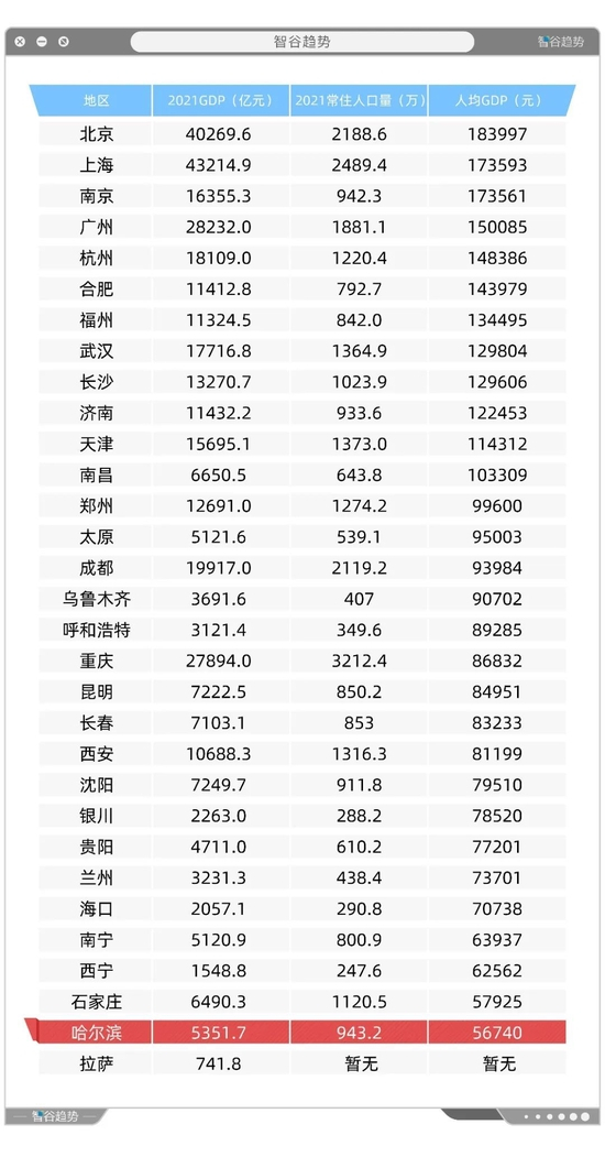 这跟黑龙江最发达的城市哈尔滨,其人均GDP排名全国31个省会/直辖市倒数第一,形成了相互印证。