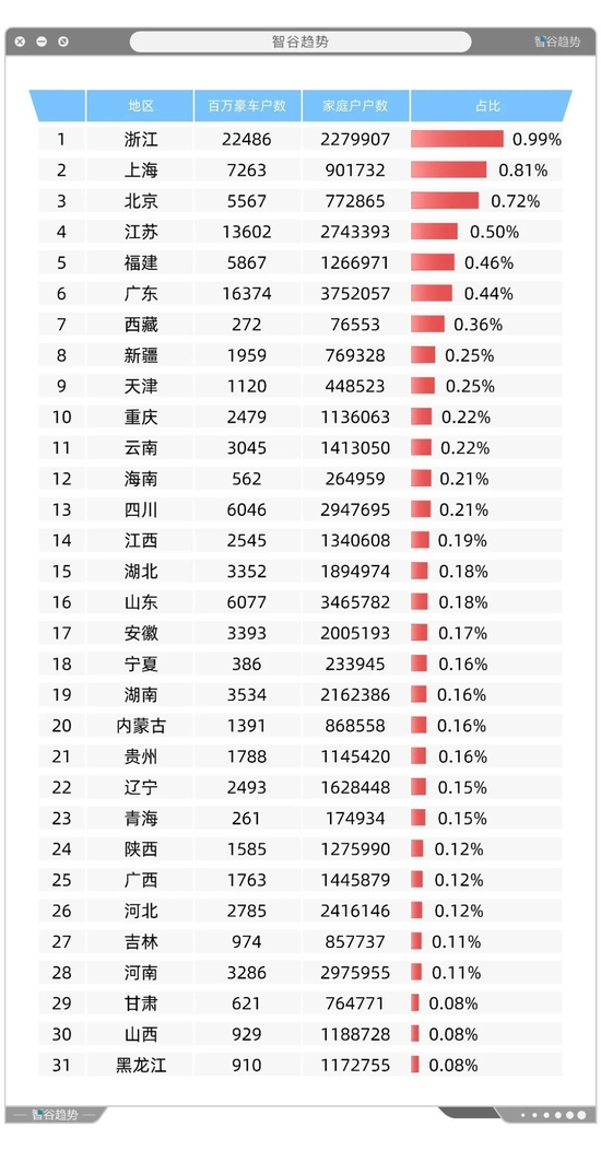 看到没有,西藏、新疆的百万豪车率,仅次于浙江、上海、北京、江苏、福建、广东这几个沿海经济发达地区。