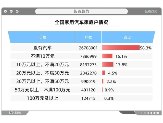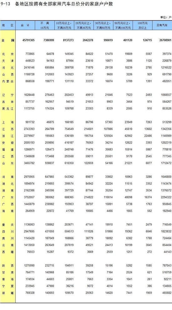 需要说明的是,上述关于中国家庭私人轿车情况的表格,所统计的家庭户数只有45791305户(0.45亿户)。