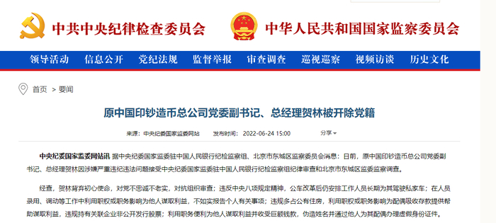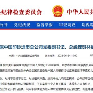 中央纪委国家监委网站24日消息,据中央纪委国家监委驻中国人民银行纪检监察组、北京市东城区监察委员会消息:日前,原中国印钞造币总公司党委副书记、总经理贺林因涉嫌严重违纪违法问题接受中央纪委国家监委驻中国人民银行纪检监察组纪律审查和北京市东城区监委监察调查。