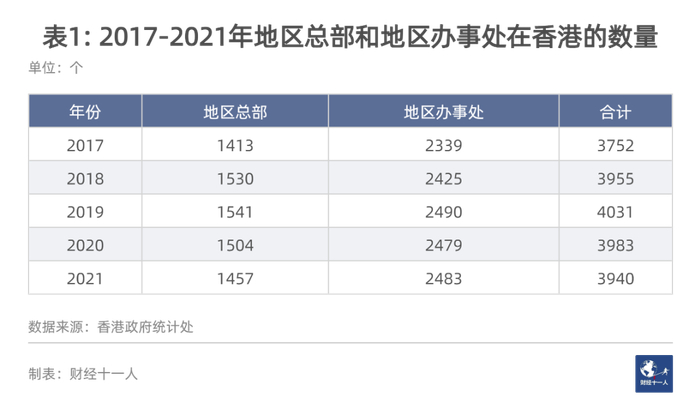 表1来自香港投资推广署及政府统计处共同进行的《2021年有香港境外母公司的驻港公司按年统计调查》。其显示跨国公司在香港的地区总部和地区办公室从2019年开始停滞不前,甚至略有下降。2021年比2019年,总部和办事处分别下降了5.5%和0.3%。