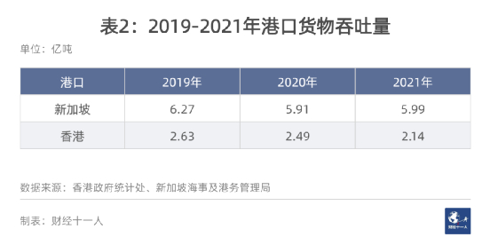 从港口集装箱吞吐量来看,新加坡港2021年的集装箱吞吐量创历史新高,达3750万个标准箱(TEU),而香港的集装箱吞吐量则持续4年下滑,2021年为1780万个标准箱(TEU)。