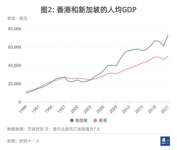 从1990年开始,新加坡的GDP增速几乎每年都高于香港。人均GDP方面,2004年以前“新港”互有胜负,2004年之后新加坡一直高于香港。2021年新加坡人均GDP72766美元,失业率2.4%。香港人均GDP 49629美元(港元兑美元汇率取值为7.8:1,下文相同),失业率4.0%。