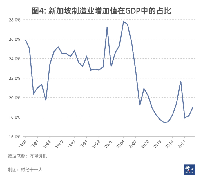 最近四十年,新加坡制造业增加值在GDP中的占比几乎一直在20%以上,而且其中大部分为高端制造业。传统制造业,比如纺织服装目前产值不到20年前的1%,而电子、计算机行业的产值比20年前增长6倍以上,药品、生物制品行业增长30倍以上。