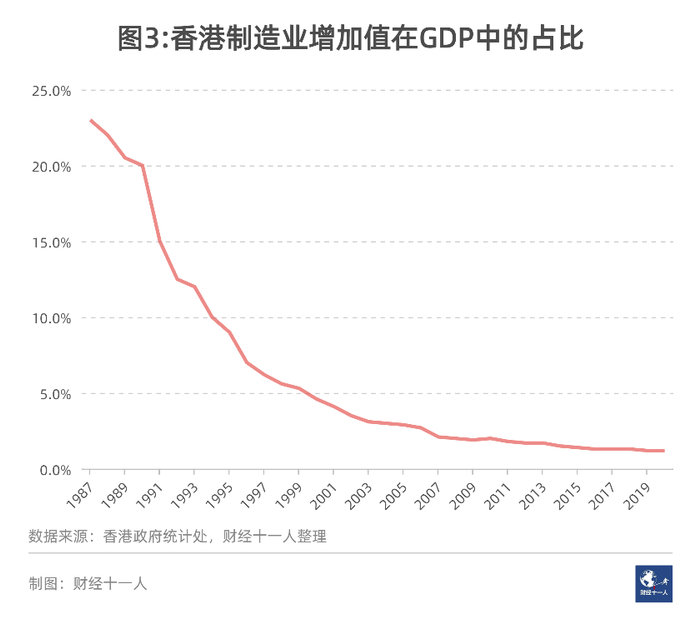 在1980-1990年,除个别年份,制造业增加值在香港GDP中的比重都在20%以上。从1990年开始,香港制造业增加值在GDP中占比快速下降。这表明低附加值制造业转移后,由于缺乏必要的引导和辅助,香港制造业未能实现升级。