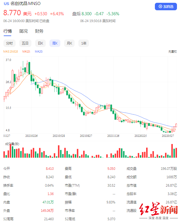 2020年10月15日,名创优品以每股20美元的定价在美国纳斯达克上市,筹资6.08亿美元。2020年底,名创优品股价最高曾达到37美元/股,但此后一路下跌,截至美东时间6月24日收盘报8.77美元/股,公司总市值约26.87亿美元。