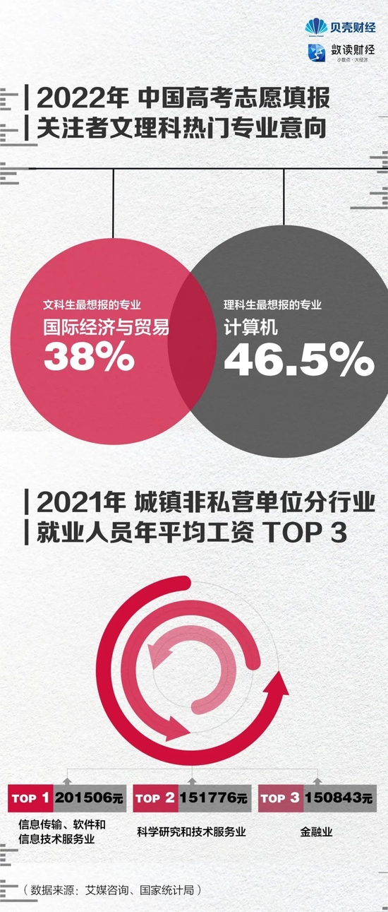 新京报贝财经记者梳理国家统计局数据发现,高考生的热门志愿填报专业与高收入行业不无联系。国家统计局数据显示,2021年城镇非私营单位分行业就业人员年平均收入前三分别是信息传输、软件和信息技术服务业、科学研究和技术服务业和金融学。