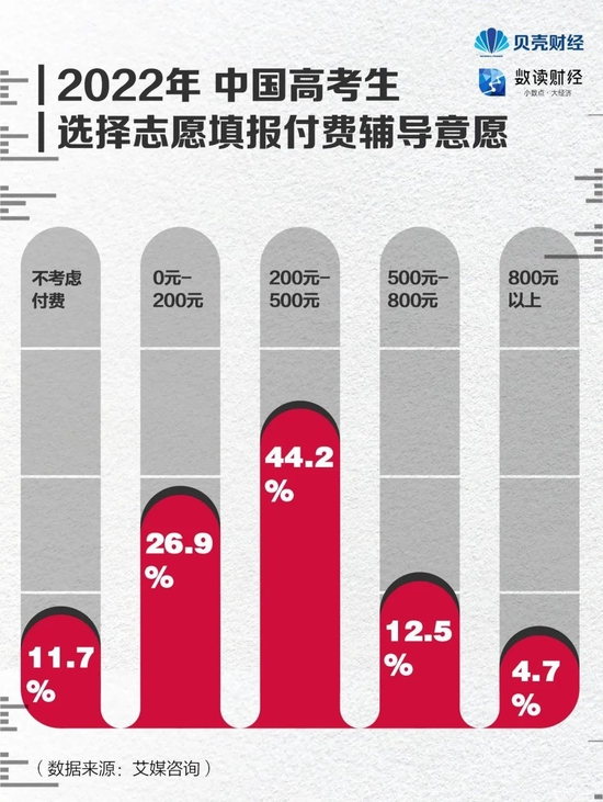 艾媒咨询数据显示,接受调研的高考生中,88.3%愿意为志愿填报付费。过半高考生愿意为志愿填报付费0-500元,其中愿意付费200-500元的占比44.2%;愿意付费0-200元的占比26.9%。然而,愿意付费500元以上的受访高考生不足两成。