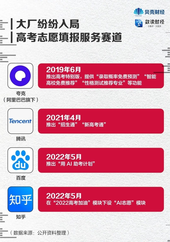 近年来每当临近高考季,大厂也纷纷推出高考相关产品,如2019年6月,阿里巴巴旗下的夸克就推出高考特别版,提供“录取概率免费预测”“智能高校免费推荐”“性格测试推荐专业”等功能。去年4月,腾讯推出“招生通”“新高考通”。近期,知乎百度也都推出了高考相关产品。