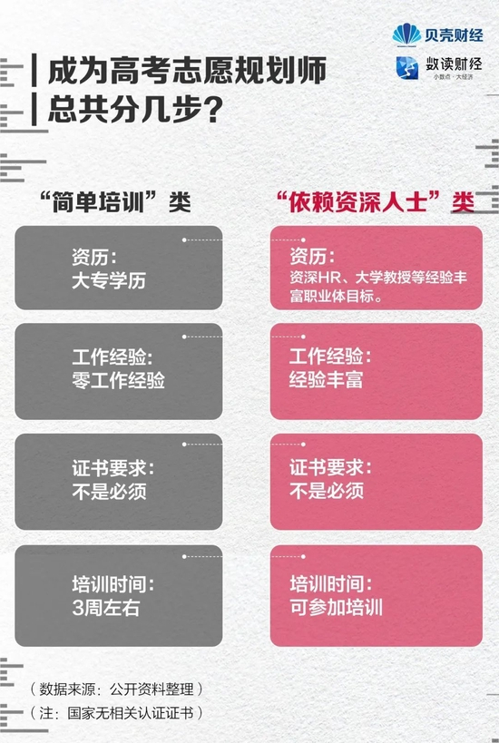 此外,新京报贝财经记者调查发现,有些高考志愿填报服务机构的“高考志愿规划师”培训数日、三周就能上岗,而此前并无相应工作经验。
