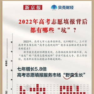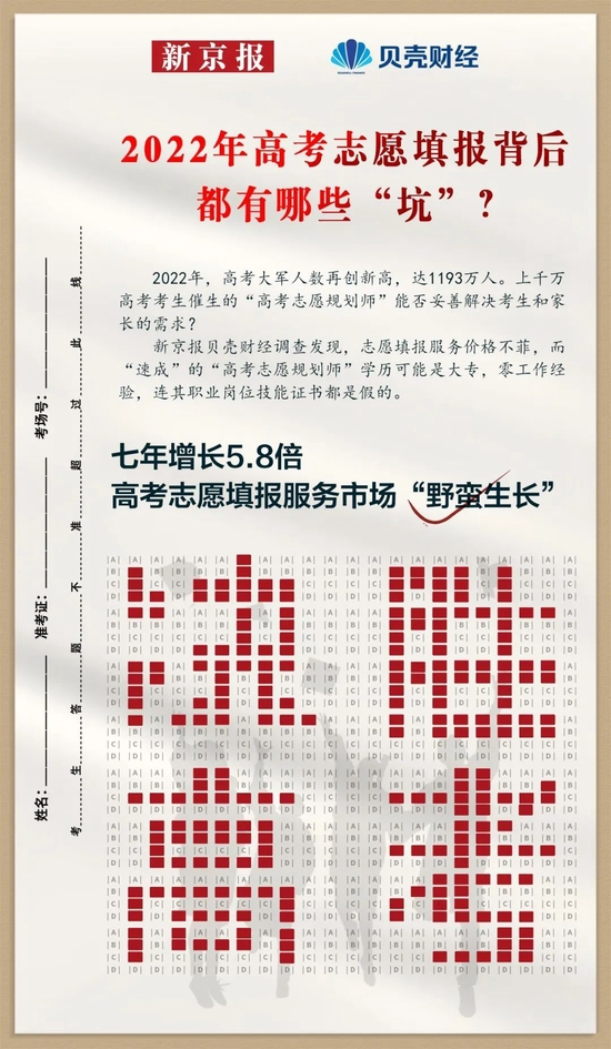 新京报贝财经记者调查发现,志愿填报服务价格不菲,而“速成”的“高考志愿规划师”学历可能是大专,零工作经验,连其职业岗位技能证书都是假的。新京报贝财经一图为你解读七年增长5.8倍的高考志愿填报服务经济,背后都有哪些“坑”?。