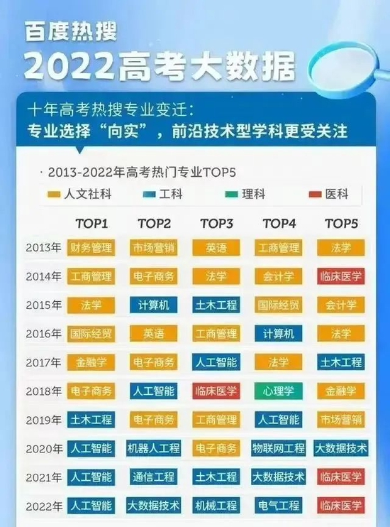 最直接的例子,根据百度热搜2022年高考大数据,十年时间,高考热门专业已经发生了翻天覆地的变化。2019年开始,热了多年的工商管理、市场营销、法学等人文社科专业,已经不再在TOP5之列,取而代之的是人工智能、通信工程、大数据技术等。2022年高考热门专业TOP5,分别是人工智能、大数据技术、机械工程、电气工程、临床医学。