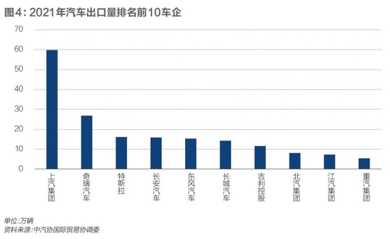 按企业来看,2021年,汽车出口量排名前十的车企依次是:上汽集团(59.8万辆)、奇瑞汽车(26.9万辆)、特斯拉(16.3万辆)、长安汽车(15.9万辆)、东风汽车(15.4万辆)、长城汽车(14.3万辆)、吉利控股(11.5万辆)、北汽集团(8.1万辆)、江汽集团(7.4万辆)和重汽集团(5.4万辆)。