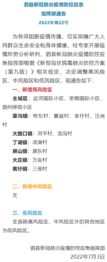 据安徽省灵璧县发布的消息,为有效阻断疫情传播,切实保障广大人民群众生命安全和身体健康,经专家开展疫情形势分析研判,灵璧县新冠肺炎疫情防控应急指挥部根据《新型冠状病毒肺炎防控方案(第九版)》相关规定,决定新增高风险区、中风险区和低风险区(2022年7月3日10时,第二批),现通告如下: