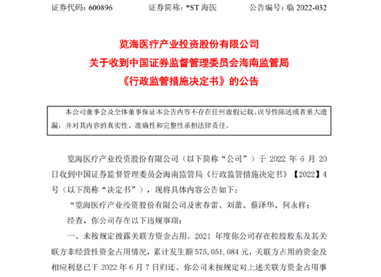 与退市公告一同披露的还有监管机构的处罚。6月21日,*ST海医因未按规定披露关联方资金占用以及债权未收回事项等,海南证监局决定对公司及董事长密春雷等高管采取出具警示函的行政监管措施,并记入资本市场诚信信息数据库。