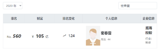 值得一提的是,密春雷的另一个身份是知名主持人董卿的老公。据此前报道,密春雷出生于上海崇明,2003年创办览海控股(集团)有限公司,为人颇为低调神秘,被称为“上海隐形富豪”。2019年的胡润百富榜上,密春雷以60亿元人民币财富排名684位。2020年密春雷再次上榜,身家超百亿。