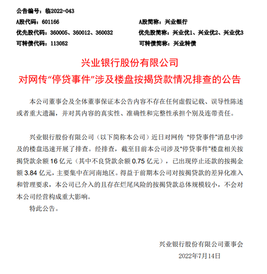 兴业银行公告:兴业银行股份有限公司(以下简称本公司)近日对网传“停贷事件”消息中涉及的楼盘迅速开展了排查。经排查,截至目前本公司涉及“停贷事件”楼盘相关按揭贷款余额16亿元(其中不良贷款余额0.75 亿元),已出现停止还款的按揭金额3.84 亿元,主要集中在河南地区。得益于前期本公司对按揭贷款的差异化准入和管理要求,本公司已介入的且存在烂尾风险的按揭贷款总体规模较小,不会对本公司经营构成重大影响。
