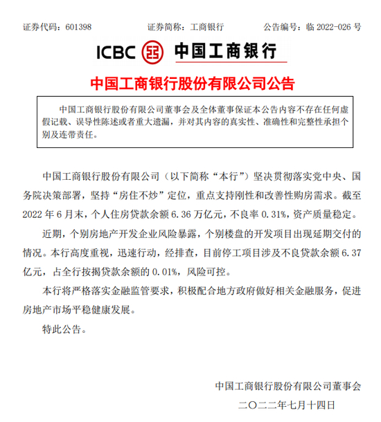 工商银行公告:中国工商银行股份有限公司(以下简称“本行”)坚决贯彻落实党中央、国务院决策部署,坚持“房住不炒”定位,重点支持刚性和改善性购房需求。截至2022年6月末,个人住房贷款余额6.36万亿元,不良率0.31%,资产质量稳定。