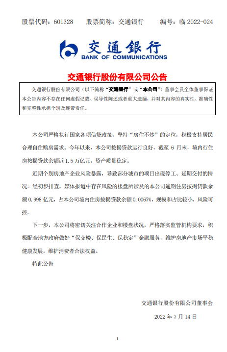 交通银行公告:本公司严格执行国家各项信贷政策,坚持“房住不炒”的定位,积极支持居民合理自住购房需求。今年以来,本公司按揭贷款运行良好,截至 6 月末,境内行住房按揭贷款余额近 1.5 万亿元,资产质量稳定。