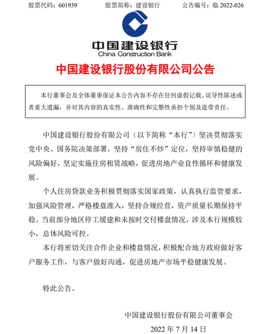 建设银行公告:中国建设银行股份有限公司(以下简称“本行”)坚决贯彻落实党中央、国务院决策部署,坚持“房住不炒”定位,坚持审慎稳健的风险偏好,坚定实施住房租赁战略,促进房地产业良性循环和健康发展。 个人住房贷款业务积极贯彻落实国家政策,认真执行监管要求,加强风险管理,严格楼盘准入,坚持合规经营,资产质量长期保持平稳。当前部分地区停工缓建和未按时交付楼盘情况,涉及本行规模较小,总体风险可控。本行将密切关注合作企业和楼盘情况,积极配合地方政府做好客户服务工作,与客户做好沟通,促进房地产市场平稳健康发展。