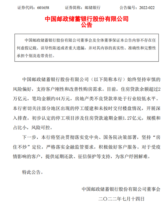 邮储银行公告:中国邮政储蓄银行股份有限公司(以下简称本行)始终坚持审慎的风险偏好,支持客户刚性和改善性购房需求。目前,住房贷款余额超过2万亿元,笔均金额约44万元,房地产类不良贷款率处于行业较低水平。本行密切关注部分地区出现的停工缓建和未按时交付楼盘情况,开展深入排查,初步认定的停工项目涉及住房贷款逾期金额1.27亿元,规模和占比小,风险可控。