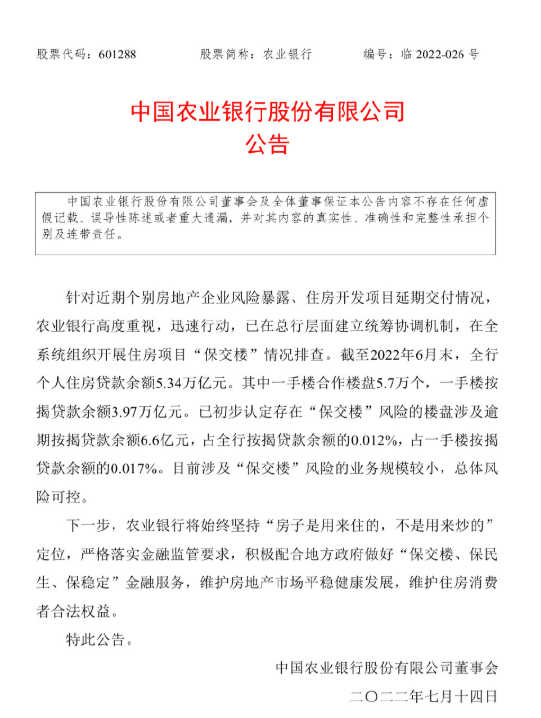 农业银行公告:针对近期个别房地产企业风险暴露、住房开发项目延期交付情况,农业银行高度重视,迅速行动,已在总行层面建立统筹协调机制,在全系统组织开展住房项目“保交楼”情况排查。截至2022年6月末,全行个人住房贷款余额5.34万亿元。其中一手楼合作楼盘5.7万个,一手楼按揭贷款余额3.97万亿元。已初步认定存在“保交楼”风险的楼盘涉及逾期按揭贷款余额6.6亿元,占全行按揭贷款余额的0.012%,占一手楼按揭贷款余额的0.017%。目前涉及“保交楼”风险的业务规模较小,总体风险可控。