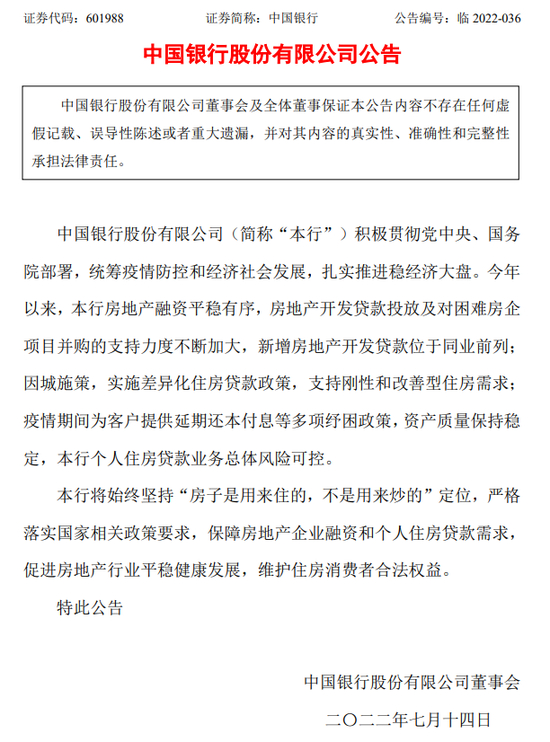 中国银行公告:中国银行股份有限公司(简称“本行”)积极贯彻党中央、国务院部署,统筹疫情防控和经济社会发展,扎实推进稳经济大盘。今年以来,本行房地产融资平稳有序,房地产开发贷款投放及对困难房企项目并购的支持力度不断加大,新增房地产开发贷款位于同业前列;因城施策,实施差异化住房贷款政策,支持刚性和改善型住房需求;疫情期间为客户提供延期还本付息等多项纾困政策,资产质量保持稳定,本行个人住房贷款业务总体风险可控。