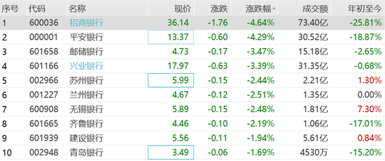 就个股来看,截至午间收盘,招商银行一度跌超6%,平安银行、兴业银行跌逾3%;板块整体来看,42家上市银行股全线飘绿,无一家实现上涨。