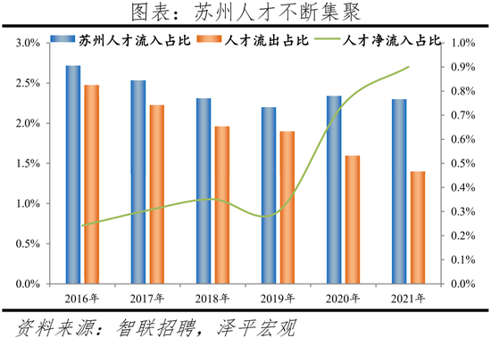 苏州在2017-2021年人才净流入占比分别为0.2%、0.3%、0.4%、0.3、0.7%、0.9%,整体呈上升趋势,人才持续集聚,主要得益于苏州经济实力雄厚且发展快、创新发展领先,且区位优势明显。近年苏州人才流入占比保持平稳,维持在2.3%左右,人才流出占比下降明显,2017-2021年人才流出占比从2.5%降至1.4%,人才流入占比大于流出占比使得人才净流入占比呈上升趋势,2017-2021年苏州人才净流入占比从0.2%升至0.9%。