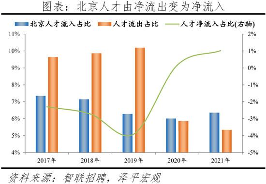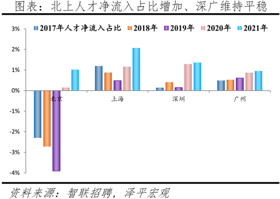 其中,北京在2017-2021年人才净流入占比分别为-2.3%、-2.7%、-3.9%、0.2%、1.0%,2021年净流入占比继续增加,主因企业招聘恢复较快、2021年北京放宽人才引进政策;2021年上海代替天津,成为北京人才流出第一目标城市,人才从北京净流向上海。2017-2020年北京人才流入占比从7.3%降至6.0%,2021年回升至6.4%。近年人才流出占比明显下降,2019-2021年人才流出占比从10.2%降至5.3%。北京的人才流入和人才流出均居全国城市首位,但过往流出逐年攀升、流出明显大于流入,使得人才呈净流出趋势,直至2020年之后人才流出明显放缓,净流出转为净流入,2019-2021年人才净流入占比分别为-3.9%、0.2%、1.0%。