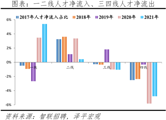 2)二线城市是苏汉人才净流入且占比呈上升趋势、杭宁人才净流入且占比稳定。从2021年人才净流入占比看,6个重点二线城市杭蓉苏宁汉长分别为1.63%、-0.04%、0.9%、0.88%、0.52%、0.04%,杭州最高、成都最低。从2017-2021年人才净流入占比变化看,杭州从1.0%逐年升至1.6%,因电商为代表的产业发展迅速、环境宜居且薪酬相对较高;苏州、武汉人才净流入占比呈上升趋势,分别从0.3%、0.03%升至0.9%、0.5%,人才集聚明显,2021年苏州GDP同比增长12.6%,为重点城市最高,武汉2017年开始实施“百万大学生留汉”政策留住人才;南京人才持续净流入,且占比持续保持稳定,南京2018年“宁聚计划”实施、落户政策宽松吸引人才;成都近年人才净流出占比逐渐下降,有集聚趋势,且对高学历人才和年轻人吸引力增强;长沙近年人才净流入占比较稳定。