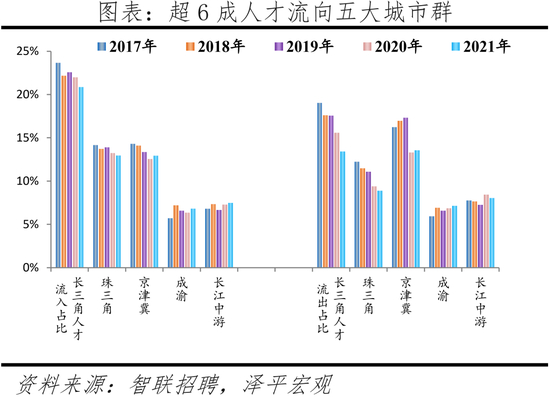 分城市群看,超6成人才流向五大城市群,长三角、珠三角、京津冀城市群人才流动性下降,成渝、长江中游城市群人才流动性小幅增加;2021年长三角、珠三角人才持续集聚,京津冀人才净流出趋势继续放缓,成渝基本平衡,长江中游人才持续净流出。2021年五大城市群人才跨区流动性下降,2017-2021年五大城市群合计人才流入占比从64.7%降至61%,人才流出占比从60.7%降至51%。从人才净流入占比看,2017-2021年长三角人才净流入占比从4.6%增至7.4%,人才净流入且占比高于其他城市群,人才大量向长三角集聚;珠三角从2.0%增至4.1%,人才净流入且逐年上升;京津冀分别为-1.9%、-2.9%、-4.0%、-0.7%,人才保持净流出但占比有所缩小,北京人才净流入占比增加带动京津冀整体净流出占比下降;成渝人才流入流出基本平衡;长江中游人才呈净流出,2021年由于流出人才占比下降,净流出占比略有下降。