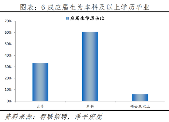 2)从学历看,高校应届生学历分布以本科学历为主,硕士及以上学历人才占比较少,其中本科占比60.6%,大专占比33.4%,硕士及以上学历占比5.9%。从院校层次看,求职者数量随着院校层次升高呈倒U型分布,其中,普通本科院校占比53.7%,高于专科院校(29.5%)、双一流院校(14.7%)、科研院所(0.7%)。