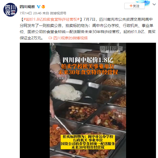 【#起价1.8亿拍卖食堂特许经营权#】7月7日,四川南充市公共资源交易网阆中分网发布了一则拍卖公告,拍卖标的物为:阆中市公办学校、行政机关、事业单位、国资公司的食堂食材统一配送服务未来30年特许经营权。起拍价1.8亿,竞买保证金2万元。